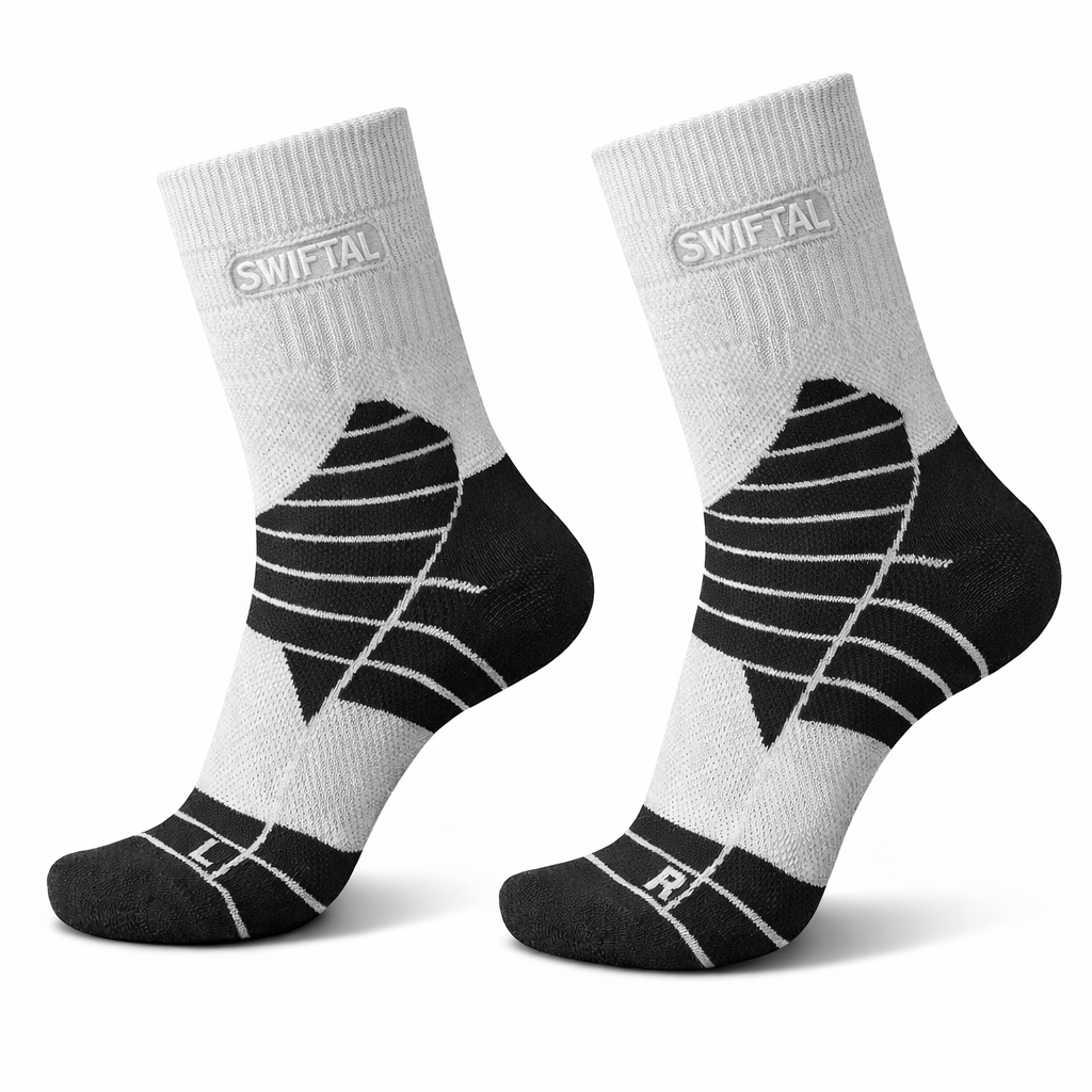 Mid‑crew running socks designed to fight blisters before they start. A performance blend of 65% nylon, 25% polyester, 6% cotton, and 4% elastane keeps the fabric tough, quick‑drying, and comfortably stretchy. Targeted cushioning over sensitive zones plus built‑in ankle support steady your foot, cut friction, and keep the sock locked in—perfect for training, race day, or daily miles.